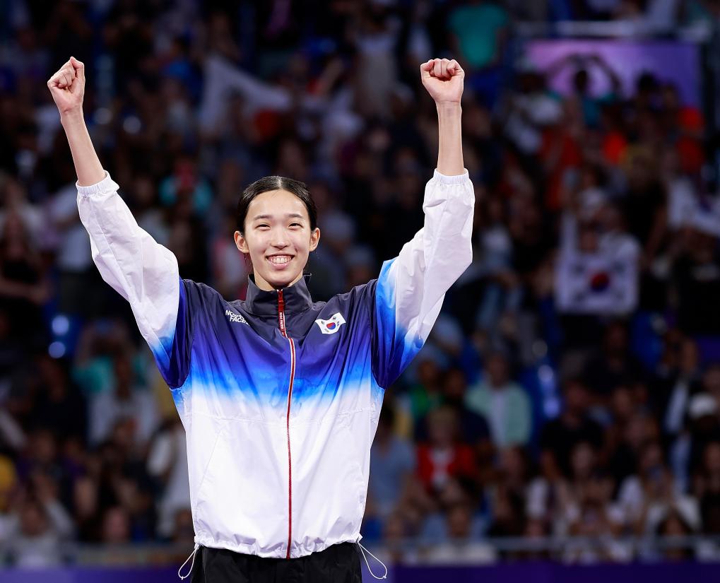 2024年8月8日,獲得冠軍的韓國(guó)選手金宥珍在巴黎奧運(yùn)會(huì)跆拳道女子57公斤級(jí)決賽頒獎(jiǎng)儀式上。新華社記者 費(fèi)茂華 攝