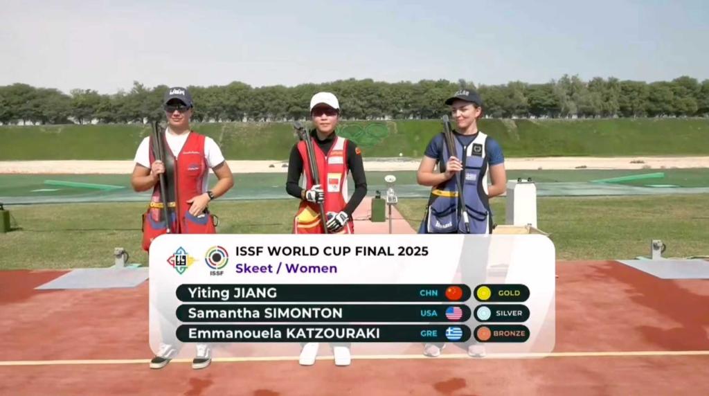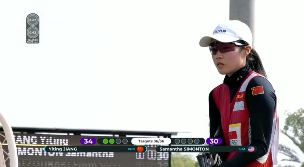 決賽中,21歲的江伊婷延續(xù)火熱手感,前32靶全部命中,以領(lǐng)先美國選手薩曼莎·西蒙頓2中的優(yōu)勢晉級最后的決勝輪。隨后,率先出場的江伊婷4靶全中,以滿中成績提前奪冠。西蒙頓最終以34中獲得亞軍,希臘選手?,斉@たǔ@季軍。另一位晉級決賽的中國選手車雨霏以24中排名第四。