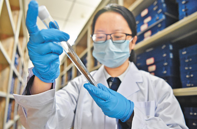甘肅簡牘博物館的工作人員在文物庫房內(nèi)查看簡牘保存情況。