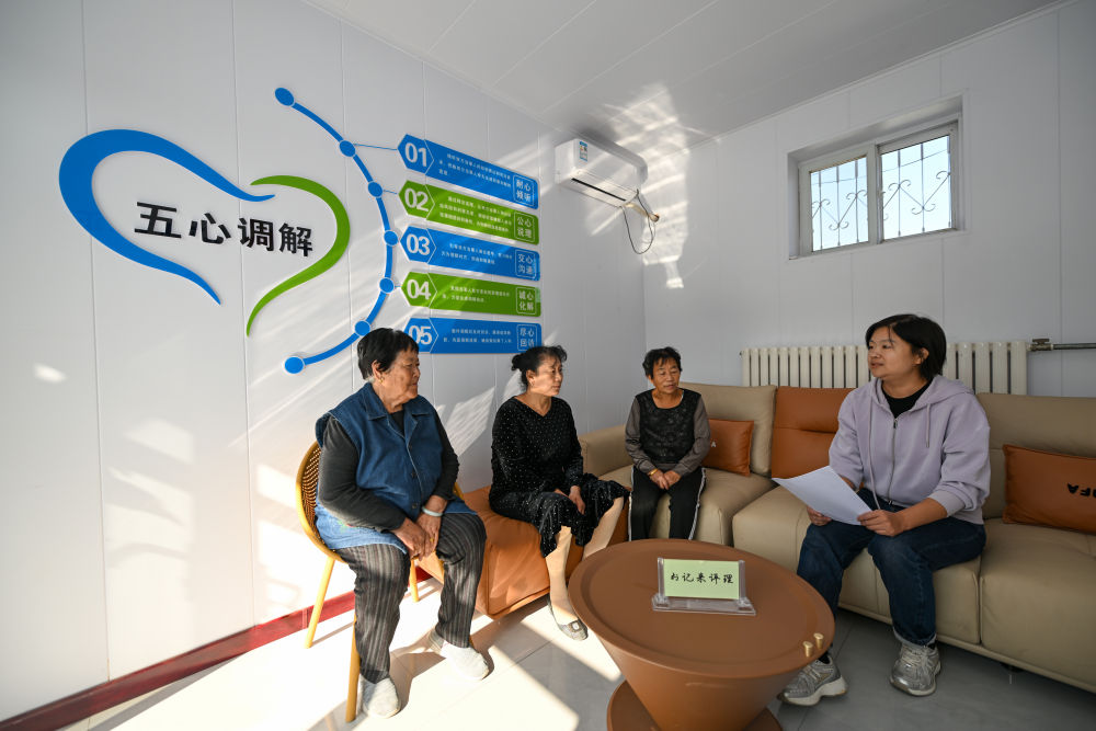 在天津市寧河區(qū)蘆臺街道金華路社區(qū),社區(qū)黨總支副書記吳蕊(右一)就社區(qū)監(jiān)控設(shè)備安裝問題為社區(qū)居民進(jìn)行解答(2024年10月11日攝)。金華路社區(qū)積極踐行新時代“楓橋經(jīng)驗”,將原社區(qū)居委會閑置用地提升改造成為聯(lián)絡(luò)群眾的基層綜合治理陣地——“解鈴小院”。新華社記者 孫凡越 攝