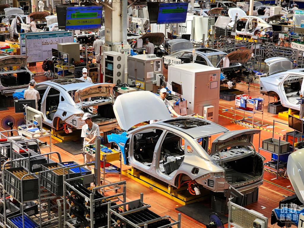 △國(guó)內(nèi)一家車企制造車間的新能源汽車生產(chǎn)線。(圖/視覺中國(guó))