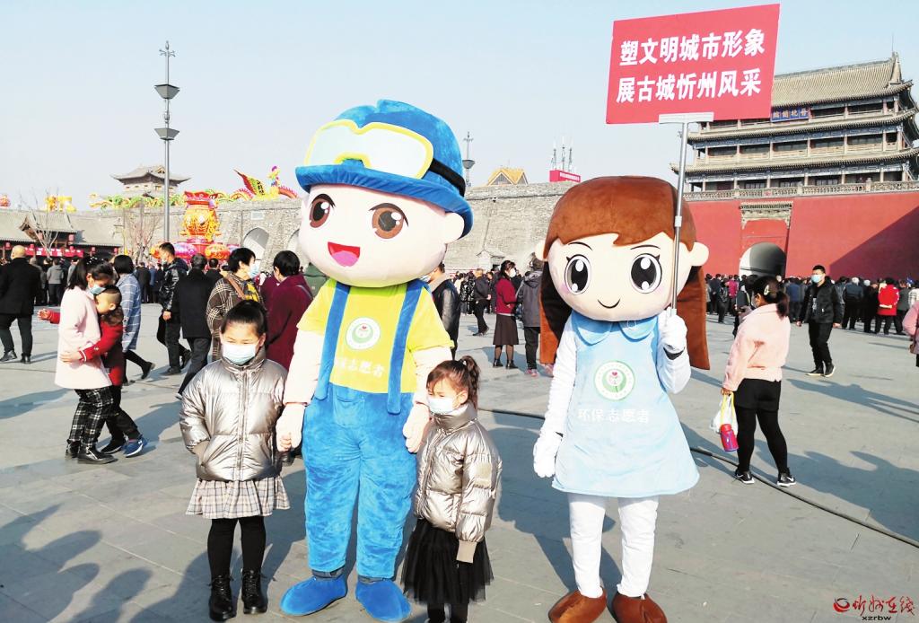 2月26日,農(nóng)歷辛丑年元宵節(jié),忻州古城北城門樓廣場上,兩名卡通形象裝扮的環(huán)保志愿者向群眾宣傳環(huán)保政策法規(guī),倡導(dǎo)環(huán)保過節(jié)、文明旅游。為豐富和活躍群眾文化生活,展現(xiàn)忻州古城保護(hù)活化新成就,元宵節(jié)期間,忻州古城舉行了社火游行,吸引了廣大市民。忻州市環(huán)保志愿者協(xié)會借機(jī)組織了環(huán)保宣傳活動。 (張劍雄 攝)
