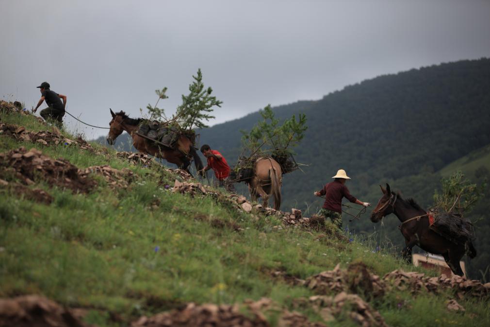 在承德豐寧滿族自治縣千松壩林場(chǎng),群眾將樹(shù)苗運(yùn)往山上。王立群 攝