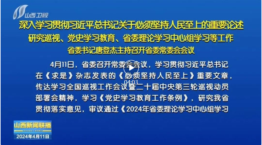 山西日報(bào)報(bào)道 4月11日,省委召開常委會(huì)會(huì)議,學(xué)習(xí)貫徹習(xí)近平總書記在《求是》雜志發(fā)表的《必須堅(jiān)持人民至上》重要文章,傳達(dá)學(xué)習(xí)全國巡視工作會(huì)議暨二十屆中央第三輪巡視動(dòng)員部署會(huì)精神,學(xué)習(xí)《黨史學(xué)習(xí)教育工作條例》,研究我省貫徹落實(shí)意見,審議通過《2024年省委理論學(xué)習(xí)中心組學(xué)習(xí)計(jì)劃》。省委書記唐登杰主持會(huì)議。