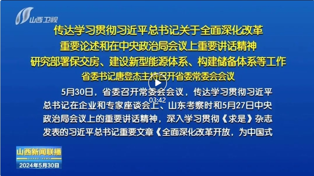 山西日報報道 5月30日,省委召開常委會會議,傳達學習貫徹習近平總書記在企業(yè)和專家座談會上、山東考察時和5月27日中央政治局會議上的重要講話精神,深入學習貫徹《求是》雜志發(fā)表的習近平總書記重要文章《全面深化改革開放,為中國式現(xiàn)代化持續(xù)注入強勁動力》,傳達貫徹全國切實做好保交房工作視頻會議精神,審議通過《山西省加快規(guī)劃建設(shè)新型能源體系的實施意見》《關(guān)于構(gòu)建山西省儲備體系的行動方案》。省委書記唐登杰主持會議。