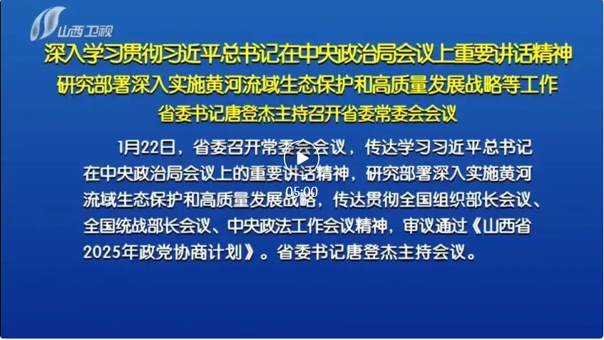 山西日?qǐng)?bào)報(bào)道 1月22日,省委召開(kāi)常委會(huì)會(huì)議,傳達(dá)學(xué)習(xí)習(xí)近平總書記在中央政治局會(huì)議上的重要講話精神,研究部署深入實(shí)施黃河流域生態(tài)保護(hù)和高質(zhì)量發(fā)展戰(zhàn)略,傳達(dá)貫徹全國(guó)組織部長(zhǎng)會(huì)議、全國(guó)統(tǒng)戰(zhàn)部長(zhǎng)會(huì)議、中央政法工作會(huì)議精神,審議通過(guò)《山西省2025年政黨協(xié)商計(jì)劃》。省委書記唐登杰主持會(huì)議。