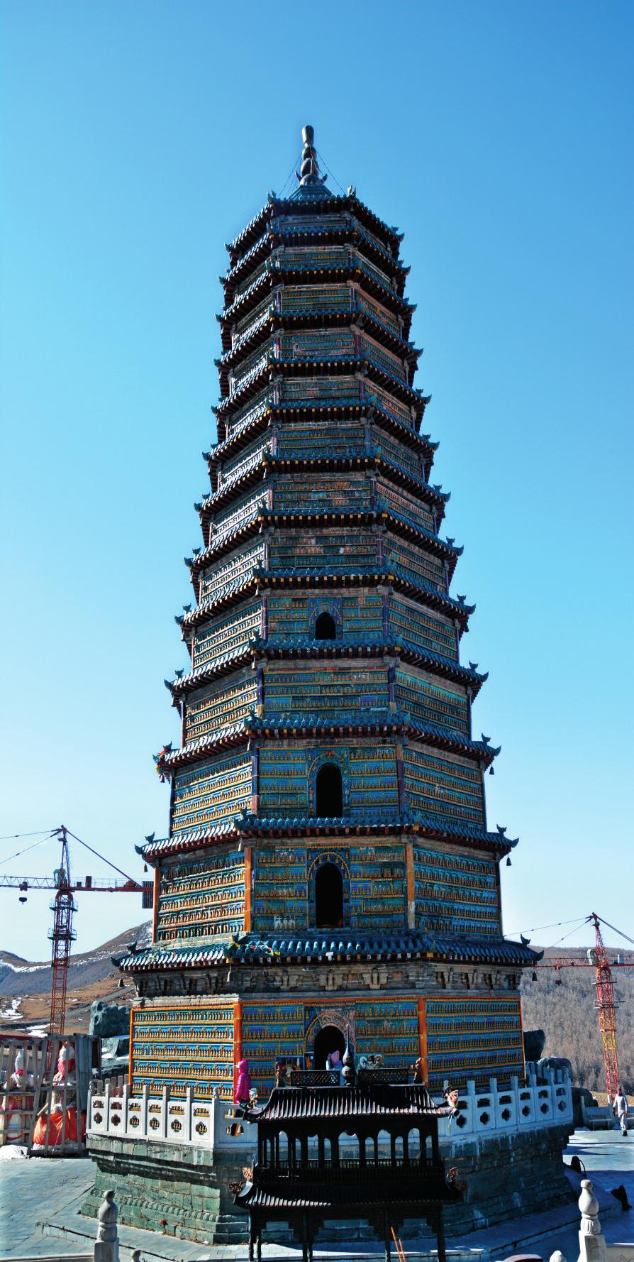 繁峙琉璃塔據(jù)塔第十一層懸掛的銅匾銘文記載,塔剎為奉皇帝之命修造,質地為“滲金”,金光閃閃,再加綠色琉璃瓦,層層飛檐相間,給人以金碧輝煌又玲瓏剔透之感,充分反映了當年明王朝社會經(jīng)濟的繁榮、科技水平的高超,展現(xiàn)出獨特的藝術氣息。塔身高大,氣勢雄偉,造型獨特,稱得上是我國現(xiàn)存琉璃塔中的典型代表,具有重大的建筑歷史研究意義。