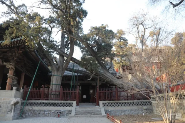 三千年晉祠的“見證者”——周柏。周柏長(zhǎng)于圣母殿右側(cè),18米長(zhǎng)的周柏向南傾斜生長(zhǎng),被另一株古柏所支撐,樹葉披覆在圣母殿頂,樹干粗壯,得幾人才能合抱,像一條橫臥的巨龍,因此有“臥龍柏”之美譽(yù)。經(jīng)科學(xué)測(cè)定,此樹已有二千九百九十多歲。在晉祠,樹齡在千年以上的蒼松、翠柏、古槐等尚存二十余株,它們和古柏一起見證著晉祠的悠悠歷史。