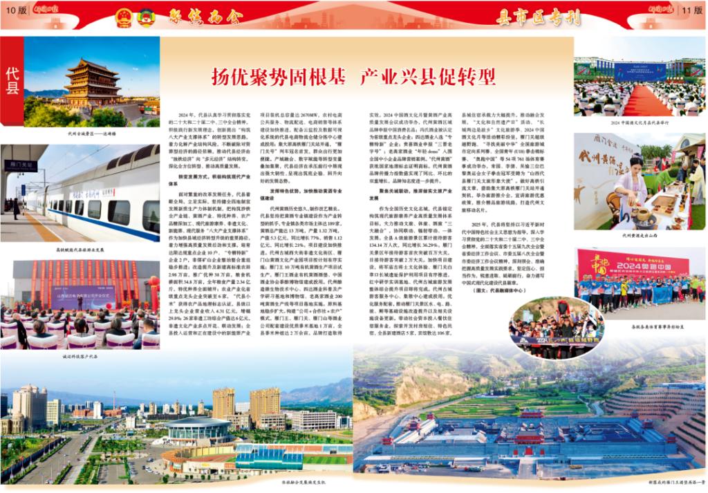 轉(zhuǎn)變發(fā)展方式,積極構(gòu)筑現(xiàn)代產(chǎn)業(yè)體系面對(duì)繁重的改革發(fā)展任務(wù),代縣著眼全局,立足實(shí)際,堅(jiān)持健全因地制宜發(fā)展新質(zhì)生產(chǎn)力體制機(jī)制,把構(gòu)筑涉鐵全產(chǎn)業(yè)鏈、黃酒產(chǎn)業(yè)、特優(yōu)種養(yǎng)、農(nóng)產(chǎn)品精深加工、現(xiàn)代旅游康養(yǎng)、非遺文化、新能源、現(xiàn)代服務(wù)“八大產(chǎn)業(yè)支撐體系”作為加快縣域經(jīng)濟(jì)轉(zhuǎn)型升級(jí)的重要路徑,著力增強(qiáng)高質(zhì)量發(fā)展后勁和支撐。培育達(dá)限達(dá)規(guī)重點(diǎn)企業(yè)10戶、“專精特新”企業(yè)2戶,非煤礦山企業(yè)整治整合重組穩(wěn)步推進(jìn);改造提升及新建高標(biāo)準(zhǔn)農(nóng)田2.98萬(wàn)畝,推廣優(yōu)種38萬(wàn)畝,糧食機(jī)耕面積34.8萬(wàn)畝,全年糧食產(chǎn)量2.34億斤,特優(yōu)種養(yǎng)全面鋪開(kāi);農(nóng)業(yè)產(chǎn)業(yè)化省級(jí)重點(diǎn)龍頭企業(yè)突破至6家,“代縣小米”獲得農(nóng)產(chǎn)品地理標(biāo)志認(rèn)證,縣級(jí)以上龍頭企業(yè)營(yíng)業(yè)收入4.31億元,增幅29.8%;26家非遺工坊綜合產(chǎn)值達(dá)6億元,非遺文化產(chǎn)業(yè)多點(diǎn)開(kāi)花、聯(lián)動(dòng)發(fā)展;全縣投入運(yùn)營(yíng)和正在建設(shè)中的新能源產(chǎn)業(yè)項(xiàng)目裝機(jī)總?cè)萘窟_(dá)2670MW,農(nóng)村電商公共服務(wù)、物流配送、電商銷售等體系建設(shè)加快推進(jìn),配備云監(jiān)控及數(shù)據(jù)可視化系統(tǒng)的代縣電商物流倉(cāng)儲(chǔ)分揀中心建成投用;集大原高鐵雁門關(guān)站開(kāi)通,“雁門關(guān)號(hào)”列車冠名首發(fā),群眾出行更加便捷。產(chǎn)城融合、數(shù)字賦能等轉(zhuǎn)型變量疊加集聚,代縣經(jīng)濟(jì)在承壓前行中展現(xiàn)出強(qiáng)大韌性,呈現(xiàn)出筑底企穩(wěn)、回升向好的發(fā)展態(tài)勢(shì)。