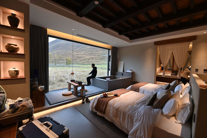 2025年10月31日,在四川省甘孜州康定市新都橋鎮(zhèn),來自浙江的游客在贊巴·明境民宿酒店的房間里休息。新華社記者 肖瀟 攝